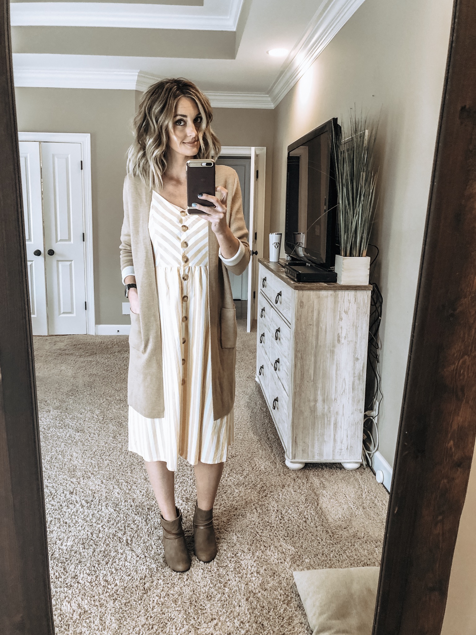 First off, how freaking cute is this dress? I love it with the boots and cardi to transition from Winter to Spring. Or Im totally picturing it with a cute jean jacket and sandals during the summer! This dress will be worn over and over again, and the best part…it was only $18.99!