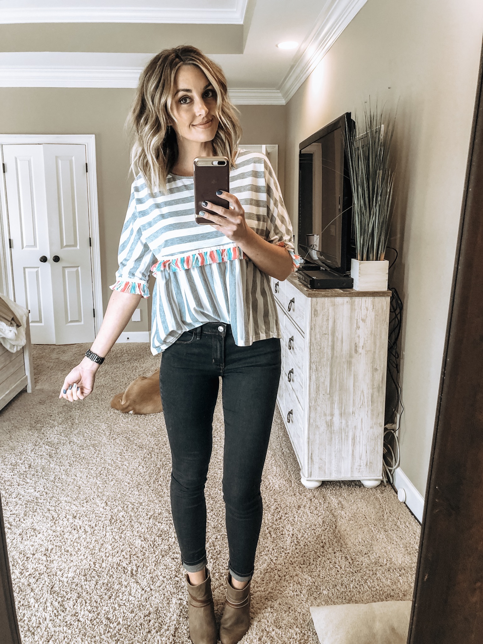 Isn’t this the most adorable top you’ve ever seen? I love the stripes, I love the fringe details, and I love the fun pops of color without it being to much! This is the perfect spring and summer shirt.