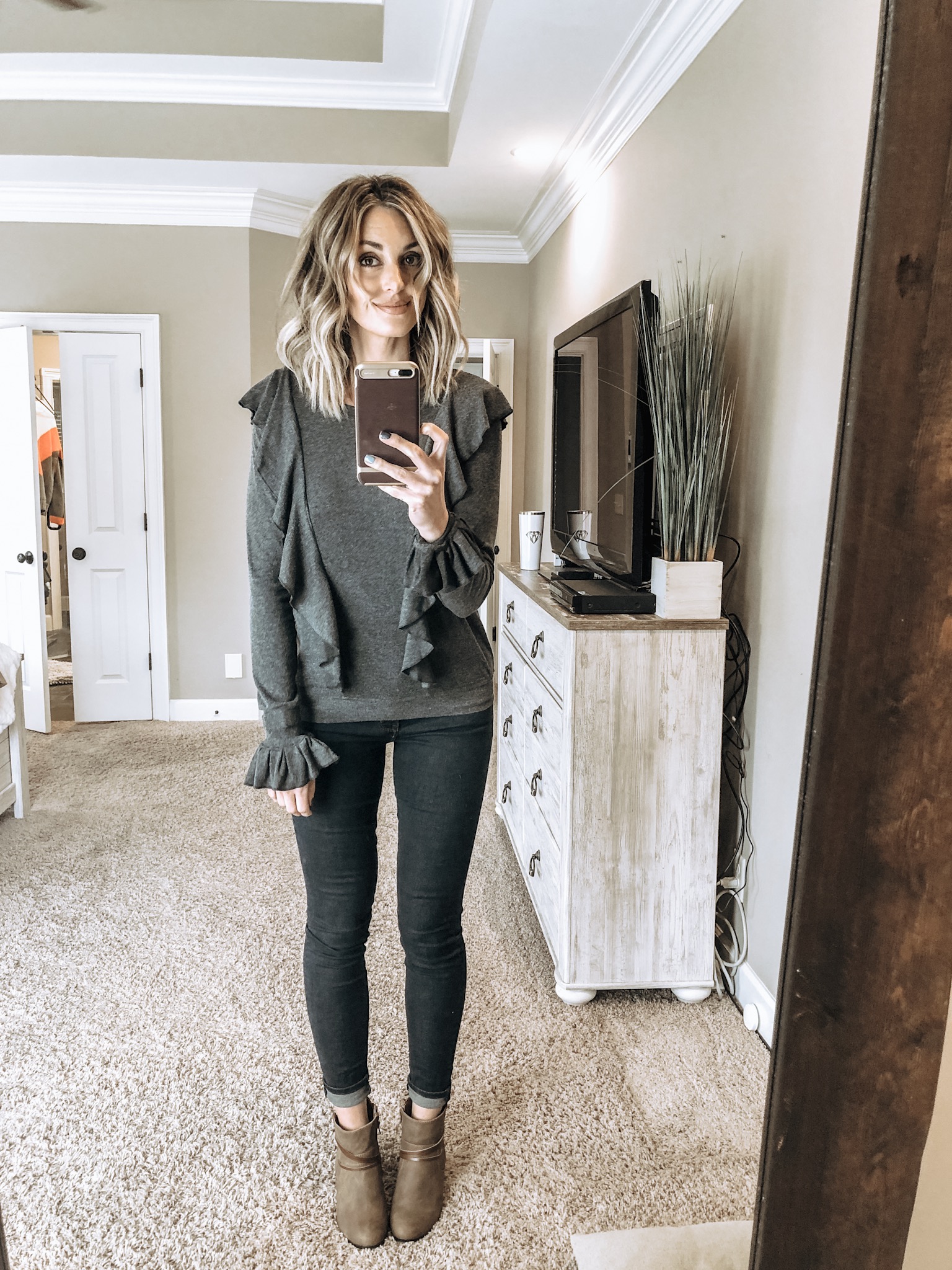 Give me all the ruffles! This top is so soft, and so flattering. I love how its tighter on the wrist, and bells out giving it a cute sleeve detail that you don’t see very often. You can dress this down with a cute pair of distressed denim, or dress it up for the office. Definitely a keeper!